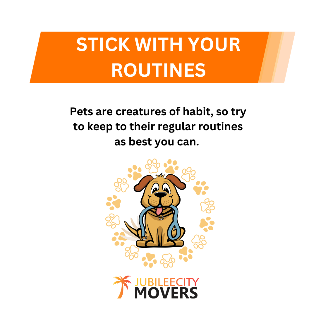Pets thrive on consistency. Try to maintain their usual feeding, walking, and play schedules as much as possible to reduce stress.